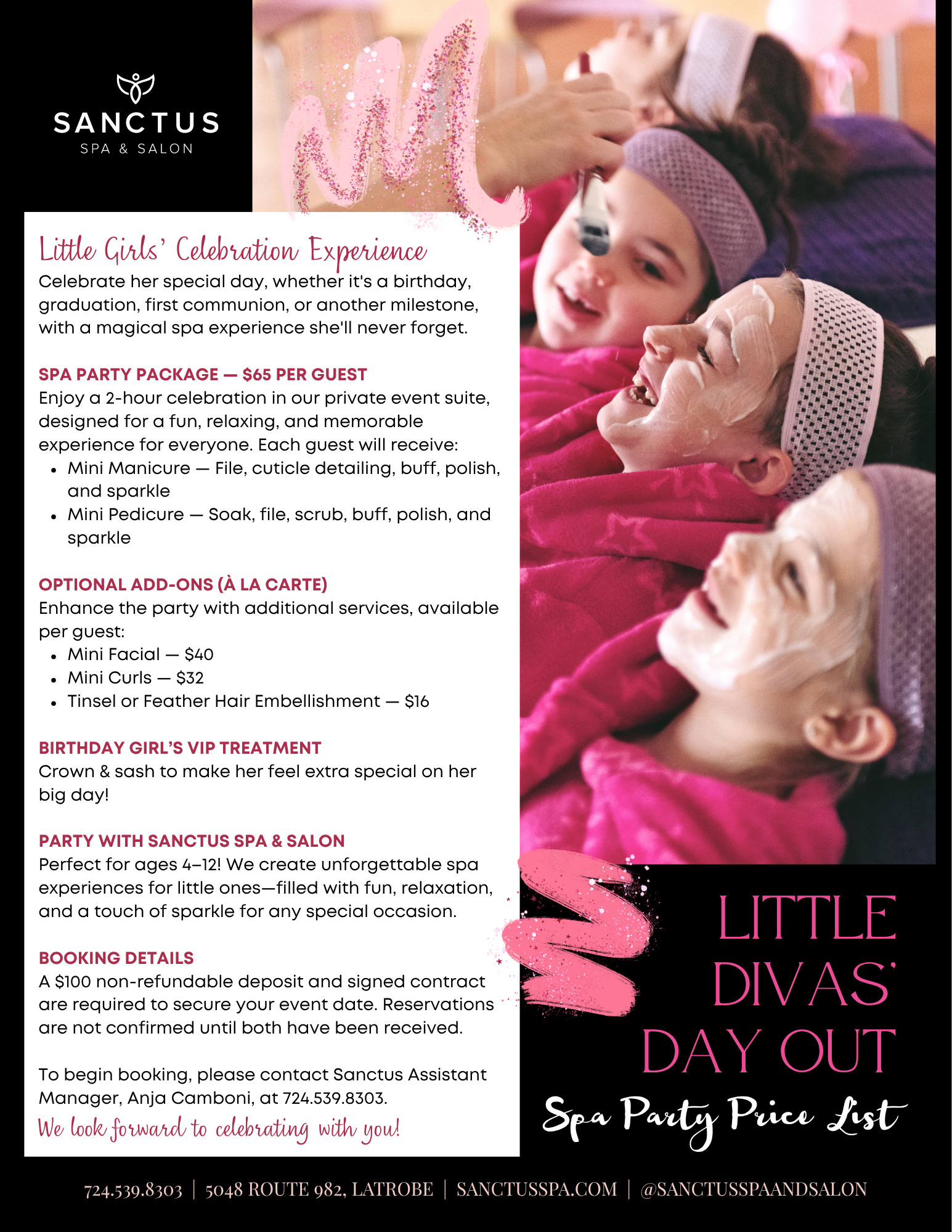 To begin booking your Little Girls’ Spa Party, please contact our Assistant Manager, Anja Camboni, directly at 724.539.8303. You may also complete the inquiry form below, and Anja will be in touch to guide you through availability, details, and next steps.